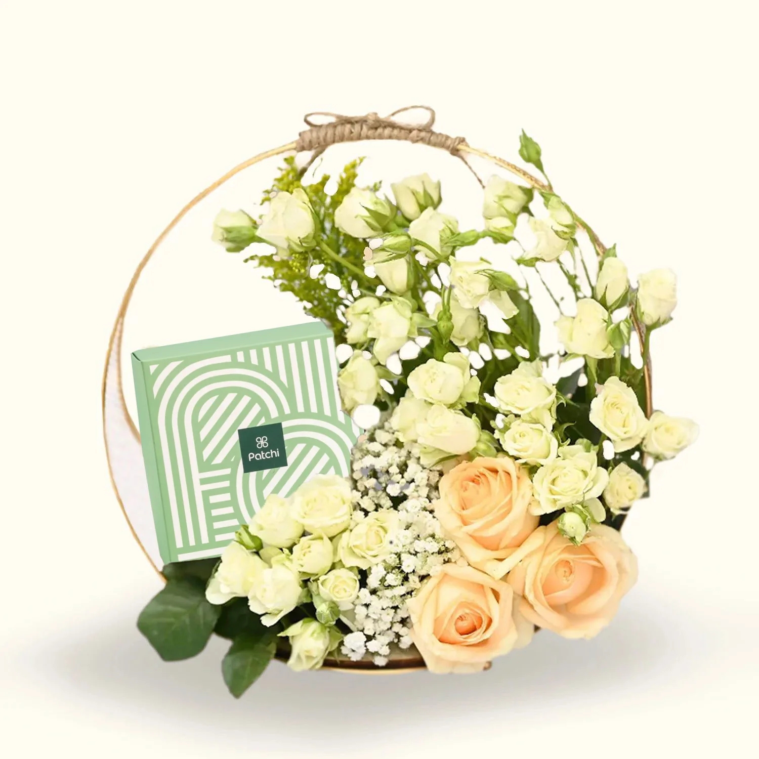باقة ورود لون أبيض أنيقة في إطار دائري مع شوكولاته